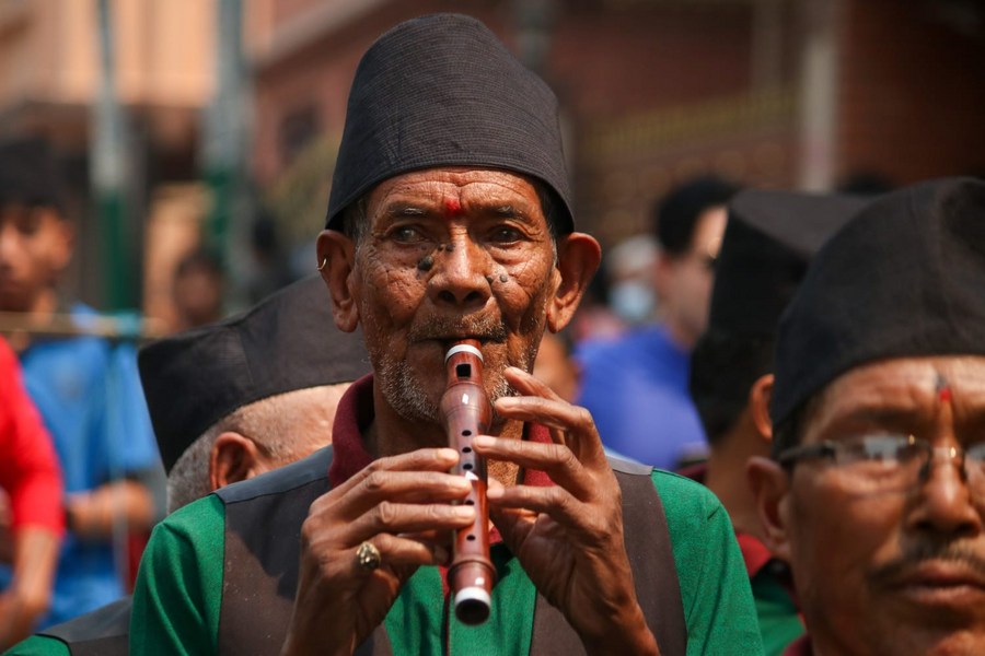 A man plays the flute during celebrations of the Lava Jatra Festival at Hadigaun in Kathmandu, Nepal, April 26, 2024. (Photo by Sulav Shrestha/Xinhua)■