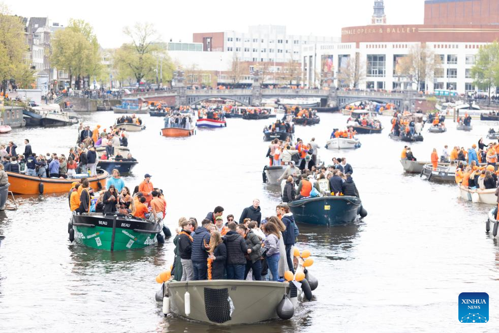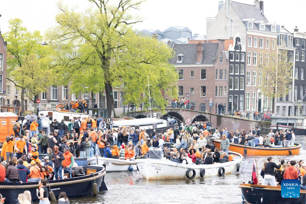 People celebrate King's Day in Amsterdam, the Netherlands, on April 27, 2024. King's Day is a national holiday in the Kingdom of the Netherlands, celebrated on April 27, King Willem-Alexander's birthday. (Photo by Sylvia Lederer/Xinhua)