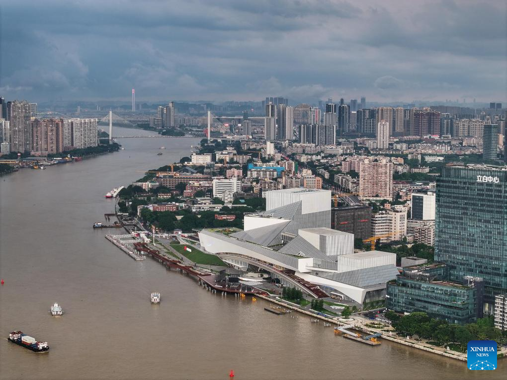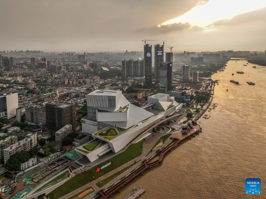 A drone photo taken on April 27, 2024 shows an exterior view of the Bai'etan Greater Bay Area Art Center in Guangzhou, south China's Guangdong Province.