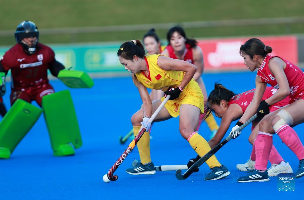 Zou Meirong (front L) of China competes during a women's hockey test match between Japan and China in Perth, Australia, April 27, 2024. (Xinhua/Ma Ping)