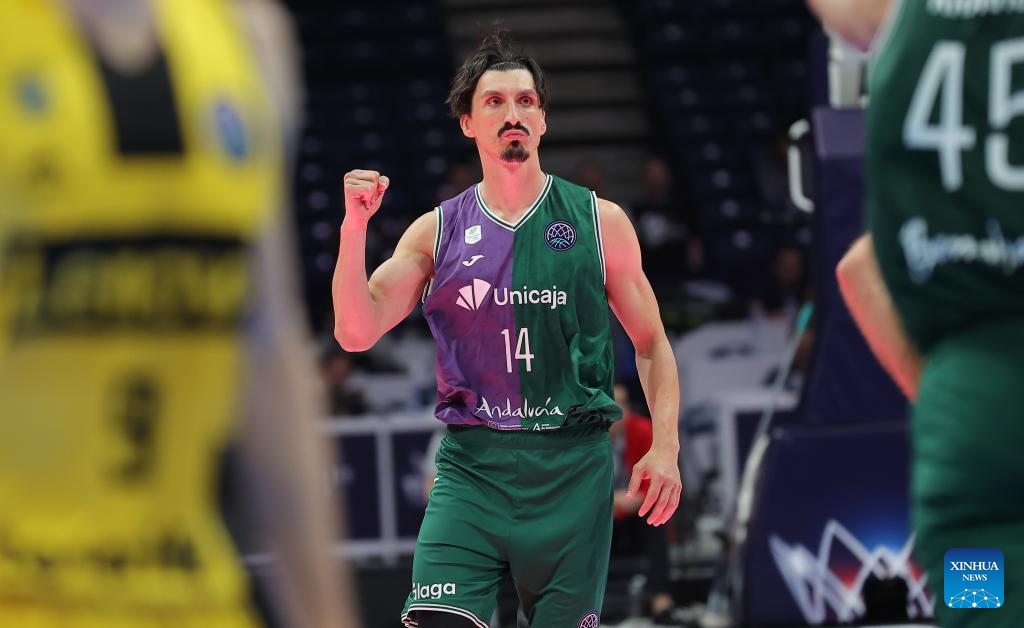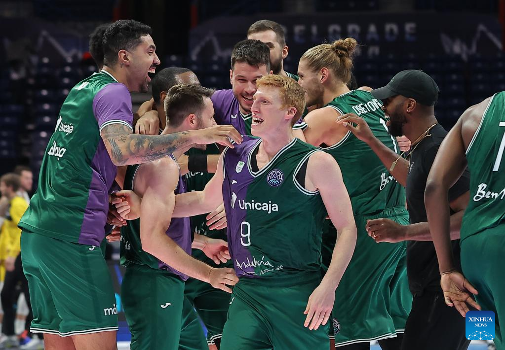 Unicaja's Nihad Dedovic celebrates during the FIBA basketball Champions League final match between Lenovo Tenerife and Unicaja in Belgrade, Serbia, on April 28, 2024. (Photo by Predrag Milosavljevic/Xinhua)