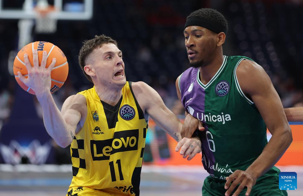 Lenovo Tenerife's Kyle Guy (L) vies with Unicaja's Kameron Taylor during the FIBA basketball Champions League final match between Lenovo Tenerife and Unicaja in Belgrade, Serbia, on April 28, 2024. (Photo by Predrag Milosavljevic/Xinhua)