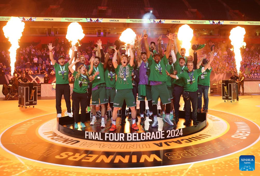 Unicaja's players celebrate with the trophy after the FIBA basketball Champions League final match between Lenovo Tenerife and Unicaja in Belgrade, Serbia, on April 28, 2024. (Photo by Predrag Milosavljevic/Xinhua)