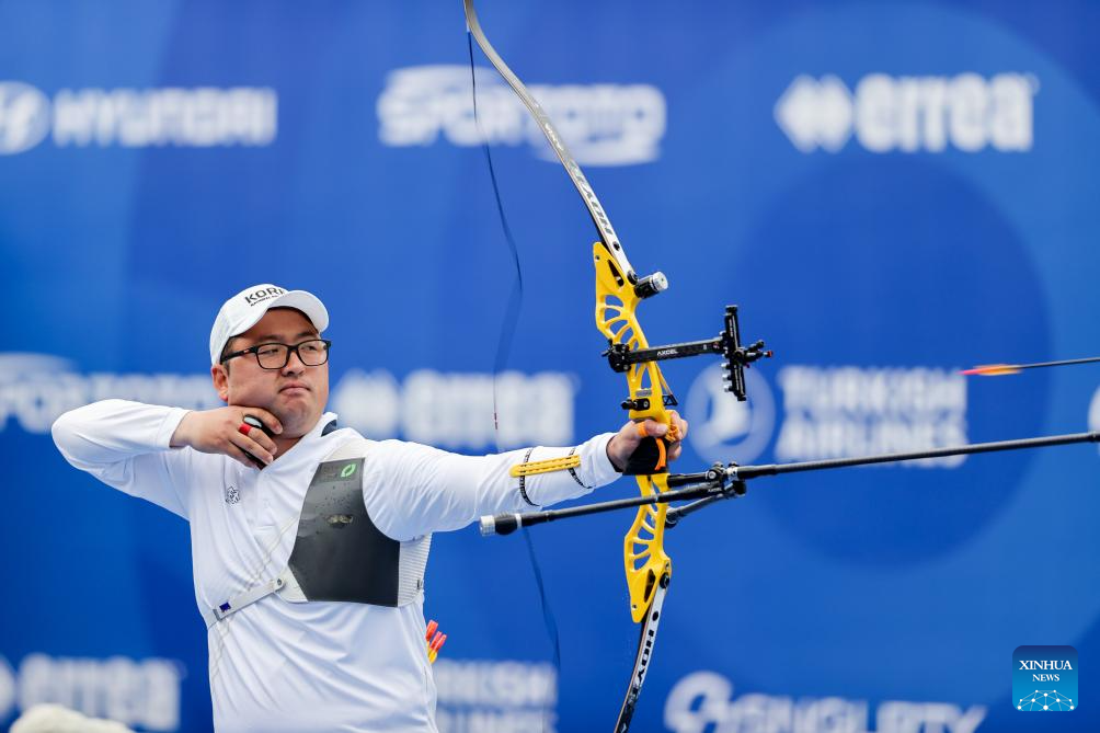 Kim Woojin of South Korea competes during the Recurve Mixed Team competition at Shanghai 2024 Archery World Cup Stage 1 in Shanghai, China, April 28, 2024. (Xinhua/Wang Xiang)