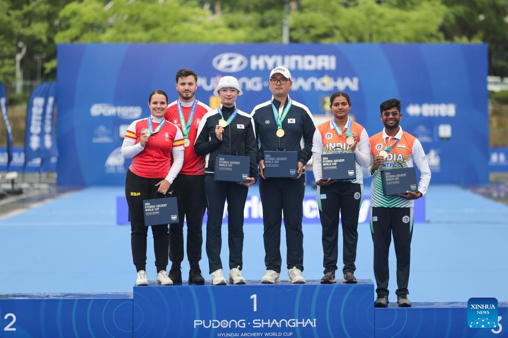 Gold medalists Lim Sihyeon (3rd L)/Kim Woojin (3rd R) of South Korea, silver medalists Elia Canales (1st L)/Andres Temino Mediel (2nd L) of Spain and bronze medalist Ankita Bhakat (2nd R)/Dhiraj Bommadevara of India pose during the awarding ceremony for the Recurve Mixed Team competition at Shanghai 2024 Archery World Cup Stage 1 in Shanghai, China, April 28, 2024. (Xinhua/Wang Xiang)