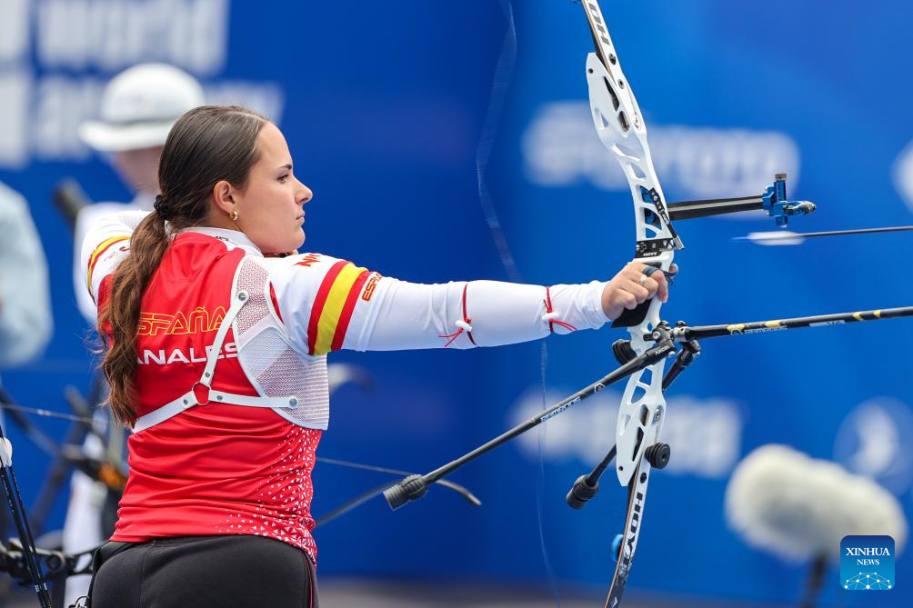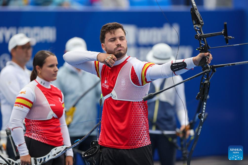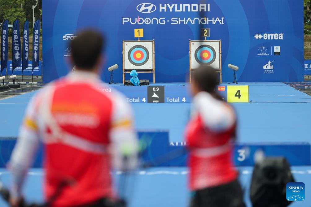 Elia Canales (L) of Spain competes during the Recurve Mixed Team competition at Shanghai 2024 Archery World Cup Stage 1 in Shanghai, China, April 28, 2024. (Xinhua/Wang Xiang)