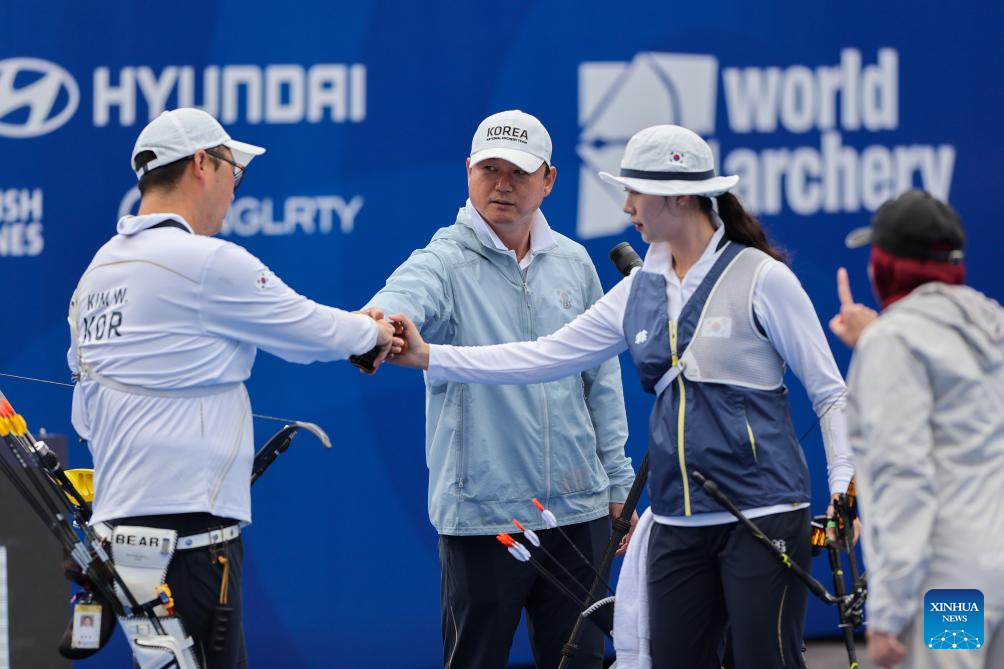 Members of South Korea team encourage each other during the Recurve Mixed Team competition at Shanghai 2024 Archery World Cup Stage 1 in Shanghai, China, April 28, 2024. (Xinhua/Wang Xiang)