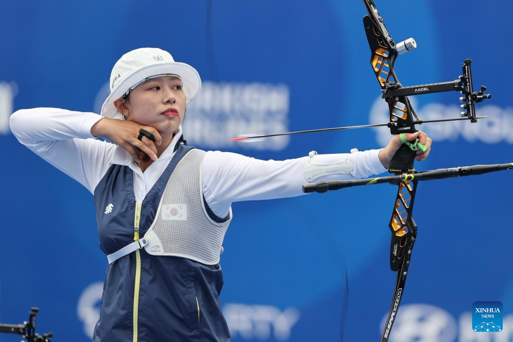 Lim Sihyeon of South Korea competes during the Recurve Mixed Team competition at Shanghai 2024 Archery World Cup Stage 1 in Shanghai, China, April 28, 2024. (Xinhua/Wang Xiang)