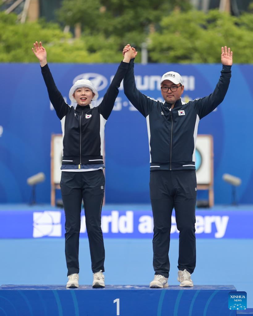 Lim Sihyeon (L) and Kim Woojin of South Korea celebrate during the awarding ceremony for the Recurve Mixed Team competition at Shanghai 2024 Archery World Cup Stage 1 in Shanghai, China, April 28, 2024. (Xinhua/Wang Xiang)