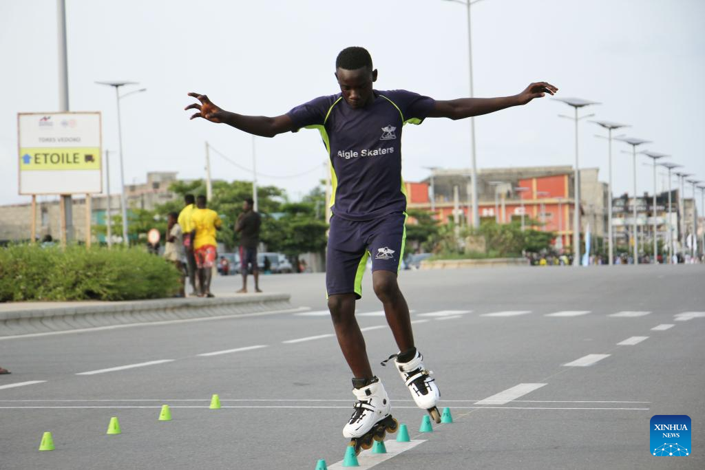 A roller skater competes in the freestyle skating during the 62nd Challenge Cotonou Skating Open in Cotonou, Benin, on April 28, 2024. (Photo by Seraphin Zounyekpe/Xinhua)