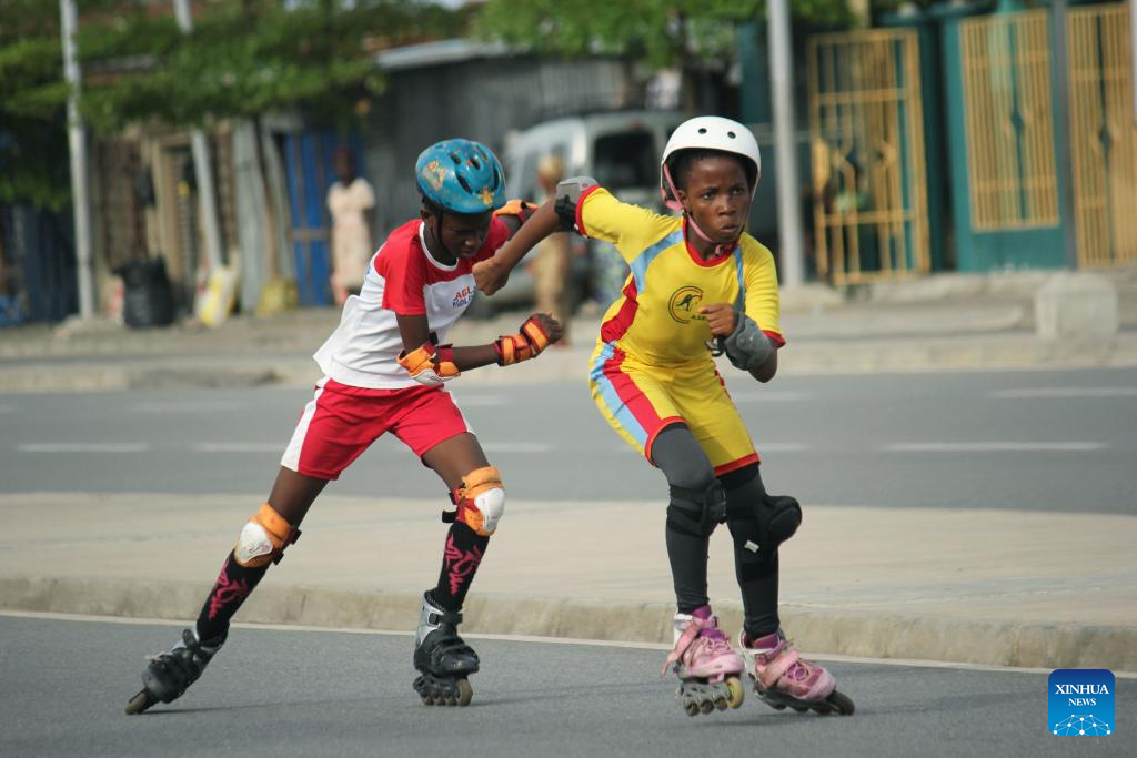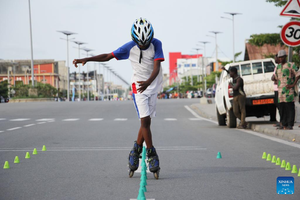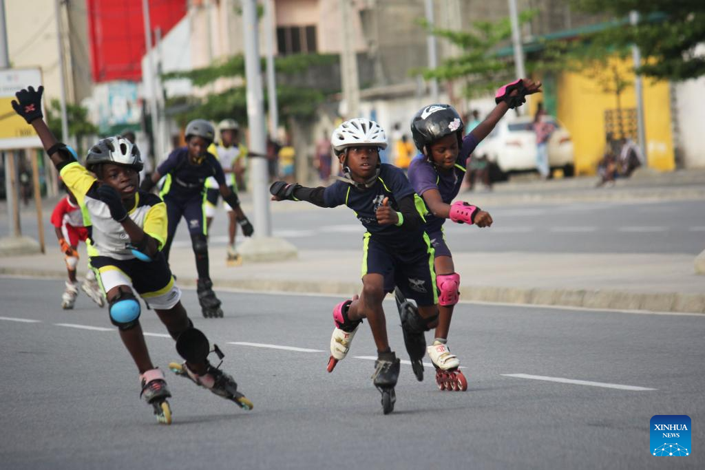Roller skaters compete in the speed roller skating during the 62nd Challenge Cotonou Skating Open in Cotonou, Benin, on April 28, 2024. (Photo by Seraphin Zounyekpe/Xinhua)