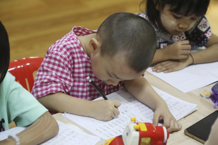 Children attend a Chinese character writing class in Yangon, Myanmar, April 28, 2024. (Photo by Myo Kyaw Soe/Xinhua)