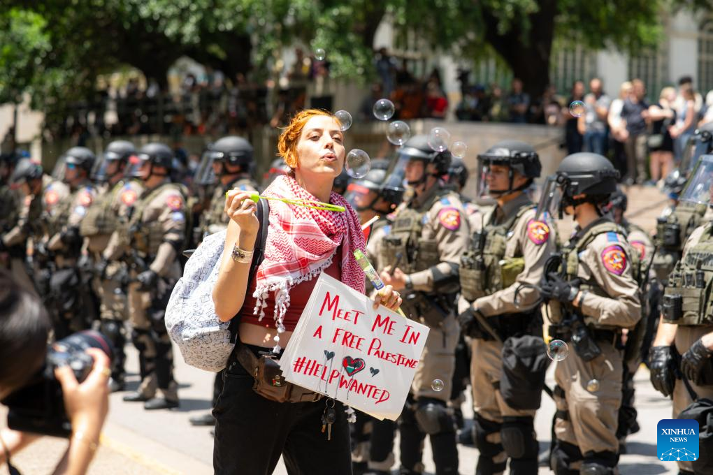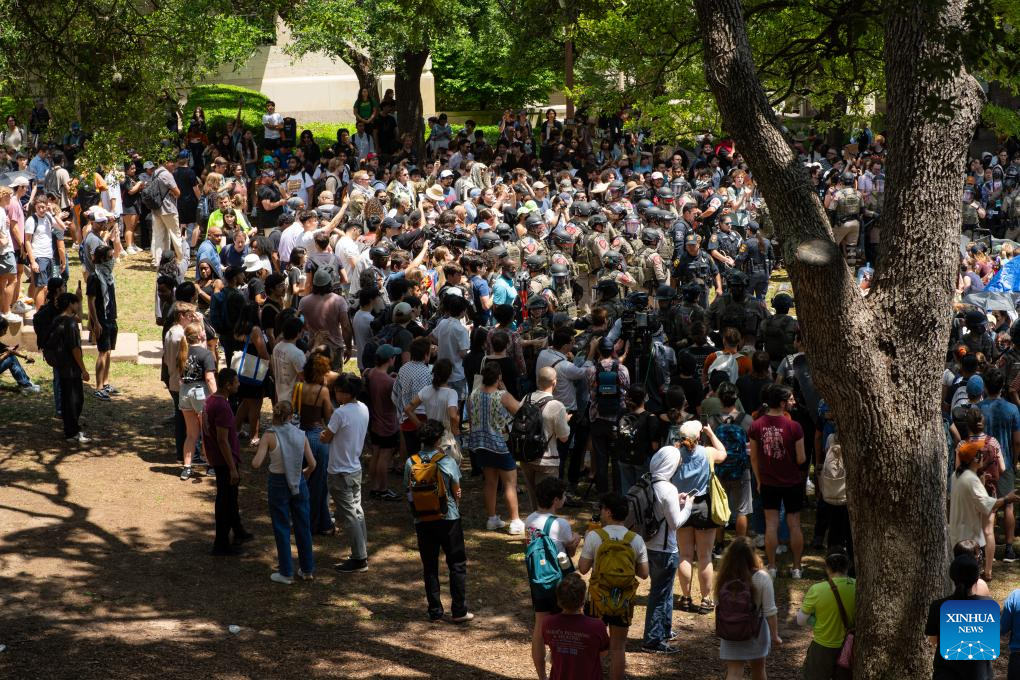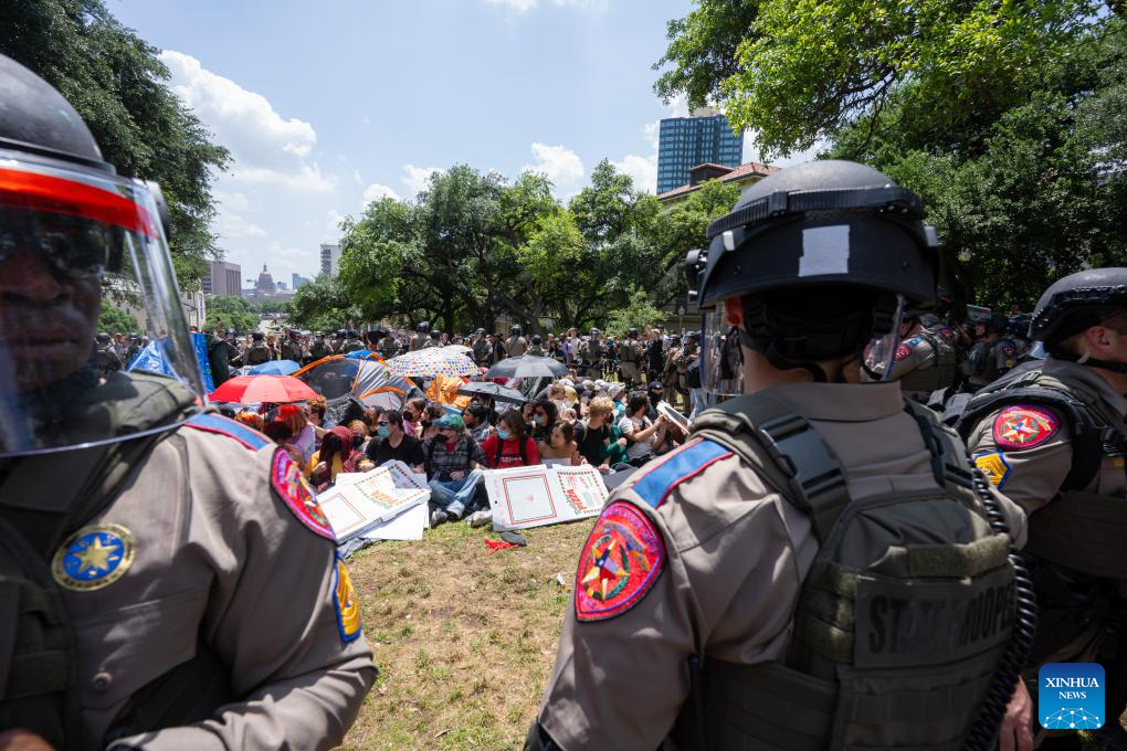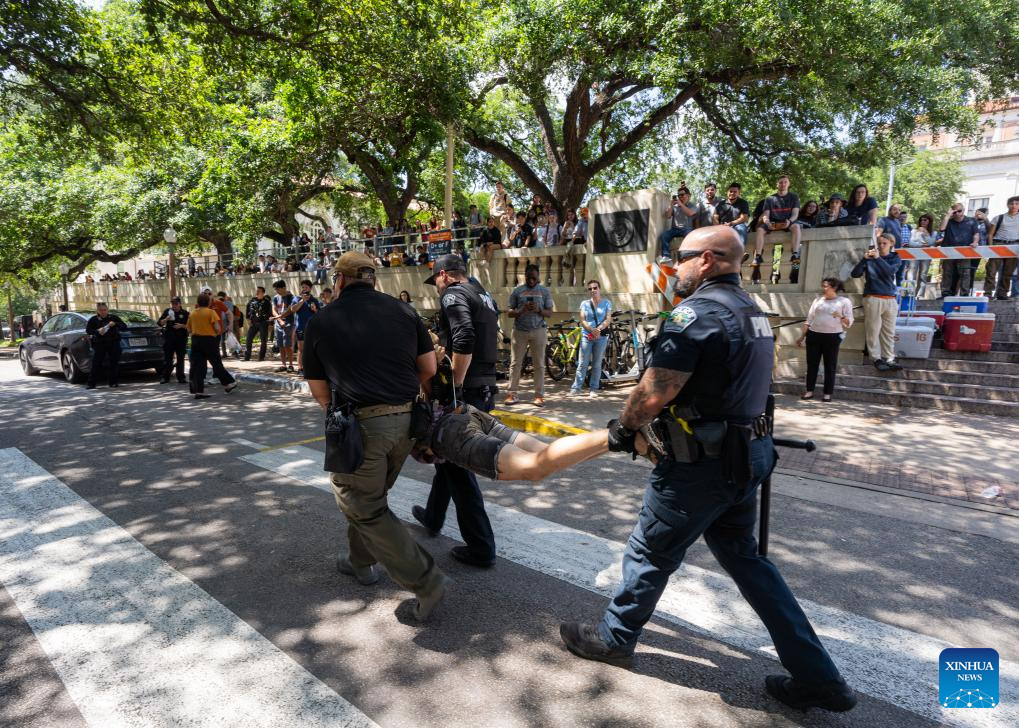 "What brought me out today was seeing the response against students here who are peacefully protesting. I find it absurd that the state and local police departments have come down upon UT Austin and arrested students and protestors for peacefully protesting," Elliott Benavides, a student with UT Austin, told Xinhua.