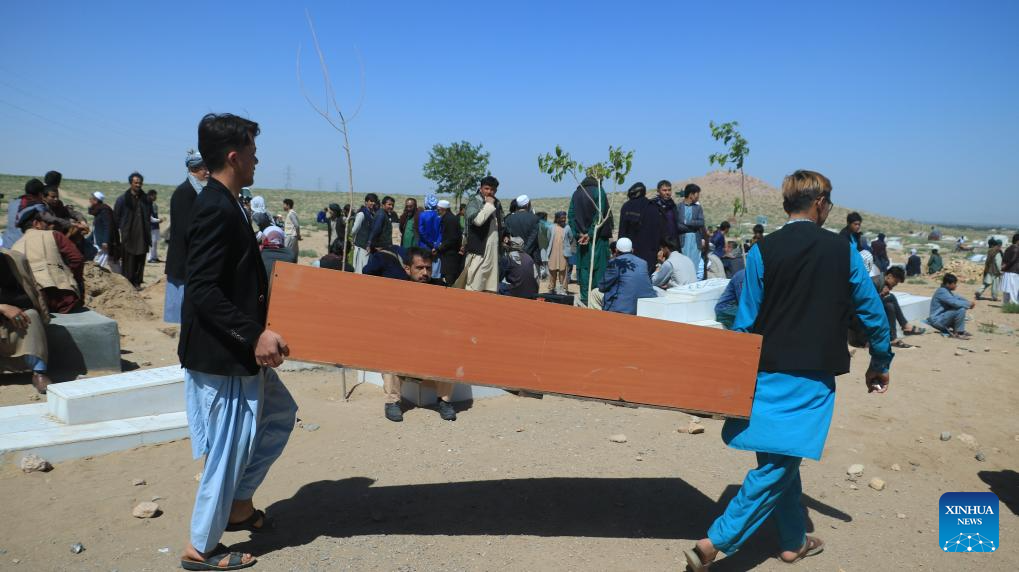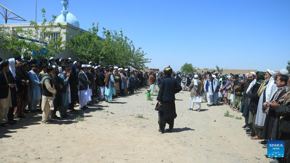People attend the funeral of victims killed in a shooting at a mosque in the Gozara district, west Afghanistan's Herat Province, on April 30, 2024. Six people were shot dead and another was injured following an attack at a mosque by gunmen in west Afghanistan's Herat province on Monday evening, spokesman for the Ministry of Interior Mufti Abdul Mateen Qani said Tuesday. (Photo by Mashal/Xinhua)