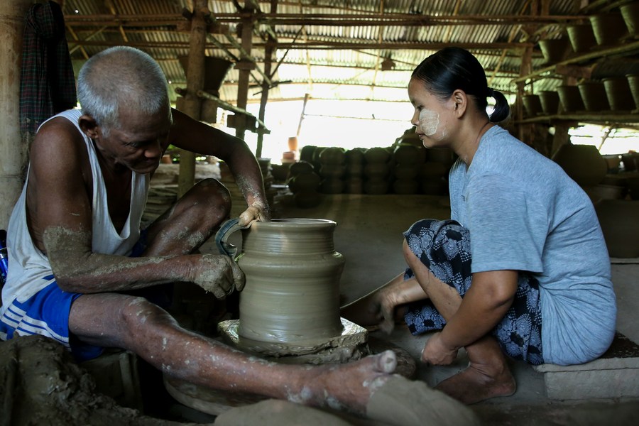 A potter works at a workshop in Twante Township of Yangon Region, Myanmar, April 29, 2024. (Photo by Myo Kyaw Soe/Xinhua)