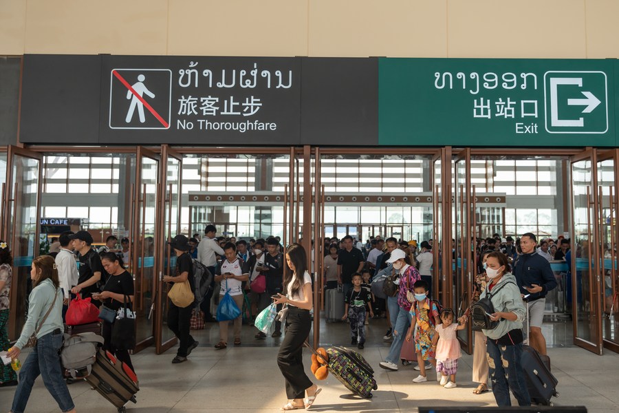 Passengers are seen at the Vientiane Station of the China-Laos Railway in Vientiane, Laos, April 11, 2024. (Photo by Kaikeo Saiyasane/Xinhua)