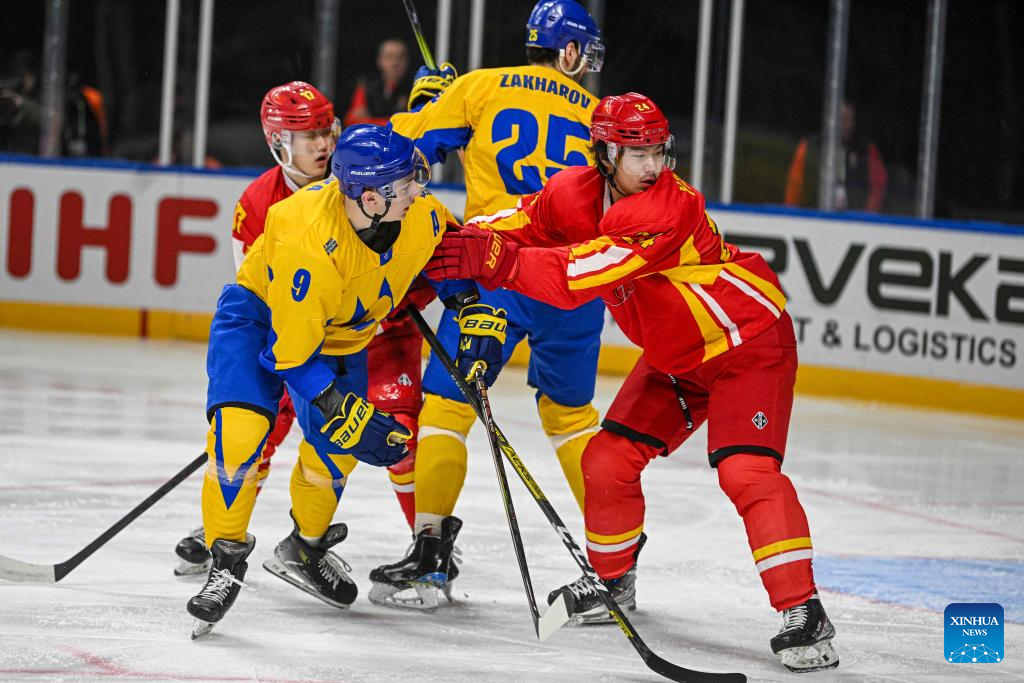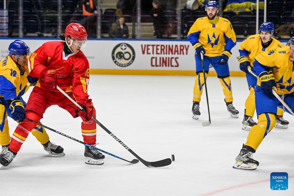 China's Yan Juncheng (2nd L) competes during the match between China and Ukraine at the 2024 IIHF Ice Hockey World Championship Division I-B in Vilnius, Lithuania, April 30, 2024. (Photo by Alfredas Pliadis/Xinhua)