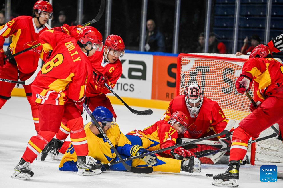 China's Guo Jianing (bottom, C) competes during the match between China and Ukraine at the 2024 IIHF Ice Hockey World Championship Division I-B in Vilnius, Lithuania, April 30, 2024. (Photo by Alfredas Pliadis/Xinhua)