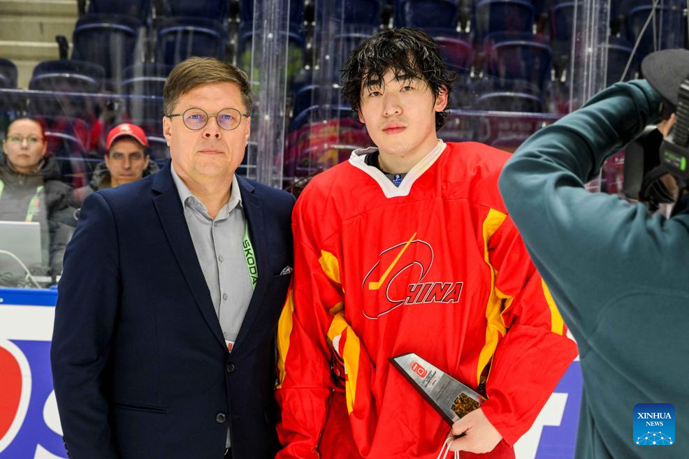 China's forwarder Zhang Zesen (R) receives the trophy of the Player of the Match after the match between China and Ukraine at the 2024 IIHF Ice Hockey World Championship Division I-B in Vilnius, Lithuania, April 30, 2024. (Photo by Alfredas Pliadis/Xinhua)