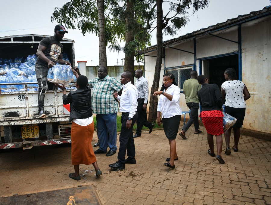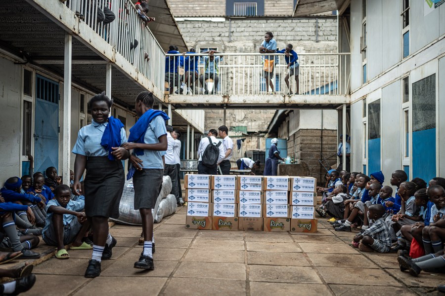 People transport donated goods at MCEDO-Beijing School in Mathare slums in Nairobi, Kenya, April 30, 2024. (Xinhua/Han Xu)
