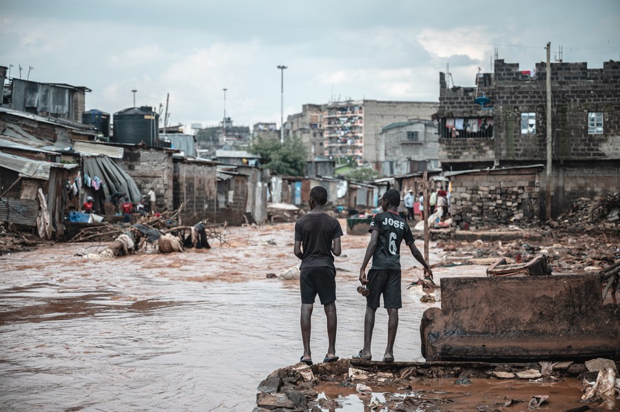 People are seen in a flood-affected area in the Mathare slums in Nairobi, Kenya, on April 30, 2024. (Xinhua/Wang Guansen)