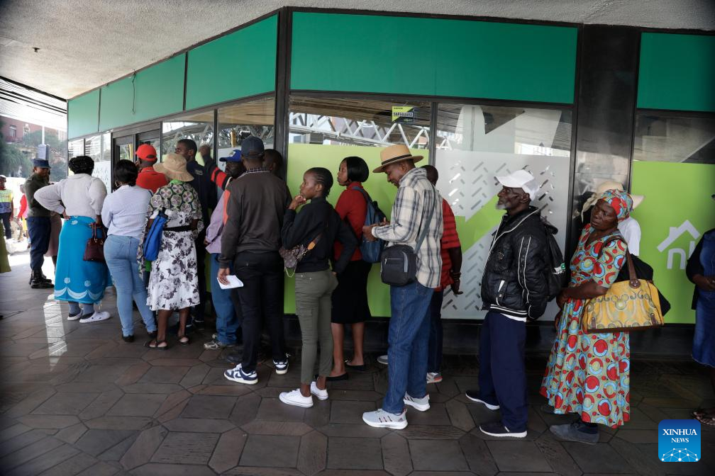 People queue to withdraw new currency Zimbabwe Gold outside a bank in Harare, Zimbabwe, on April 30, 2024. Zimbabwe's new ZiG notes and coins began circulating on Tuesday, marking a significant step in the country's monetary reform to curb inflation just three weeks after the electronic form of the currency started trading. (Photo by Shaun Jusa/Xinhua)