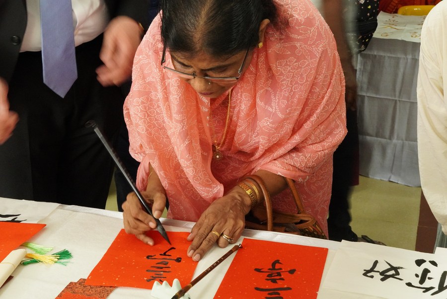 A woman tries to write Chinese calligraphy during a celebration of the United Nations Chinese Language Day in Dhaka, Bangladesh, on April 25, 2024.(Xinhua)