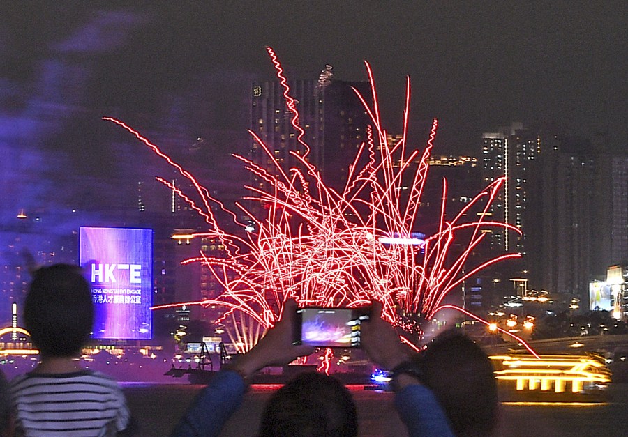 People watch a firework show at the Victoria Harbor in Hong Kong, south China, May 1, 2024. (Xinhua/Chen Duo)