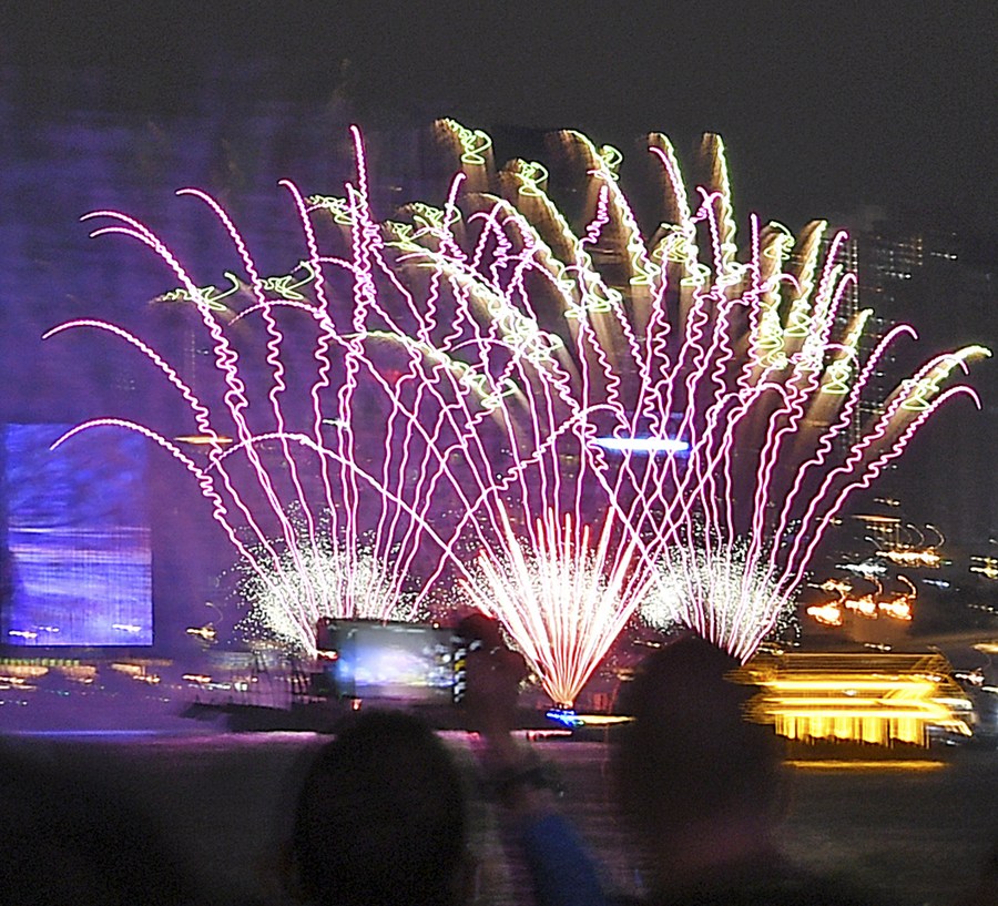 Starting at 8 p.m. local time (1200 GMT), the 10-minute display blended in with the night view of the Victoria Harbor and is accompanied by a light and music show. The gold-toned fireworks were set off from a boat 130 meters offshore.