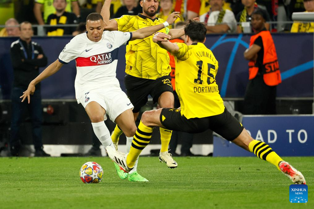 Kylian Mbappe (2nd L) of Paris Saint-Germain breaks through during the UEFA Champions League semi-final first leg football match between Borussia Dortmund and Paris Saint-Germain in Dortmund, Germany, May 1, 2024. (Photo by Joachim Bywaletz/Xinhua)