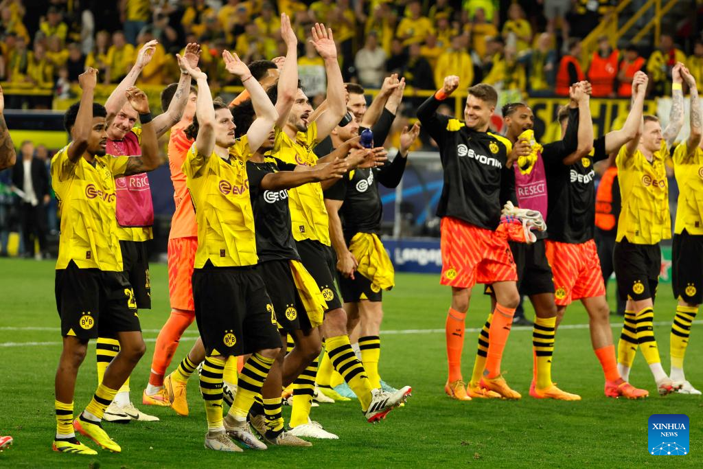 Players of Borussia Dortmund acknowledge the spectators after winning the UEFA Champions League semi-final first leg football match between Borussia Dortmund and Paris Saint-Germain in Dortmund, Germany, May 1, 2024. (Photo by Joachim Bywaletz/Xinhua)