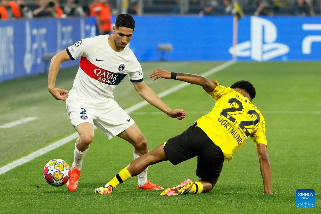 Ian Maatsen (R) of Borussia Dortmund vies with Achraf Hakimi of Paris Saint-Germain during the UEFA Champions League semi-final first leg football match between Borussia Dortmund and Paris Saint-Germain in Dortmund, Germany, May 1, 2024. (Photo by Joachim Bywaletz/Xinhua)