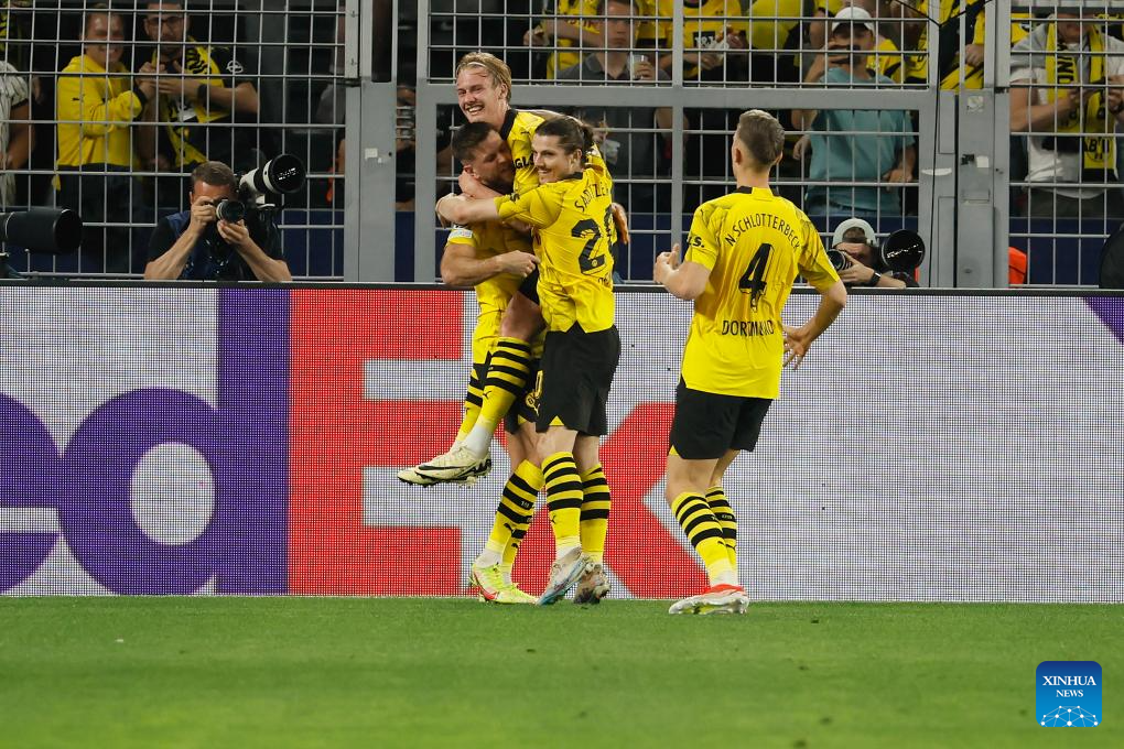 Niclas Fuellkrug (1st L) of Borussia Dortmund celebrates scoring with his teammates during the UEFA Champions League semi-final first leg football match between Borussia Dortmund and Paris Saint-Germain in Dortmund, Germany, May 1, 2024. (Photo by Joachim Bywaletz/Xinhua)