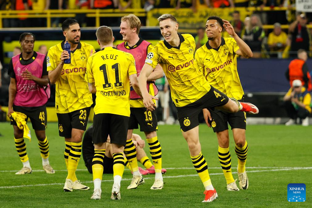 Players of Borussia Dortmund celebrate victory after winning the UEFA Champions League semi-final first leg football match between Borussia Dortmund and Paris Saint-Germain in Dortmund, Germany, May 1, 2024. (Photo by Joachim Bywaletz/Xinhua)