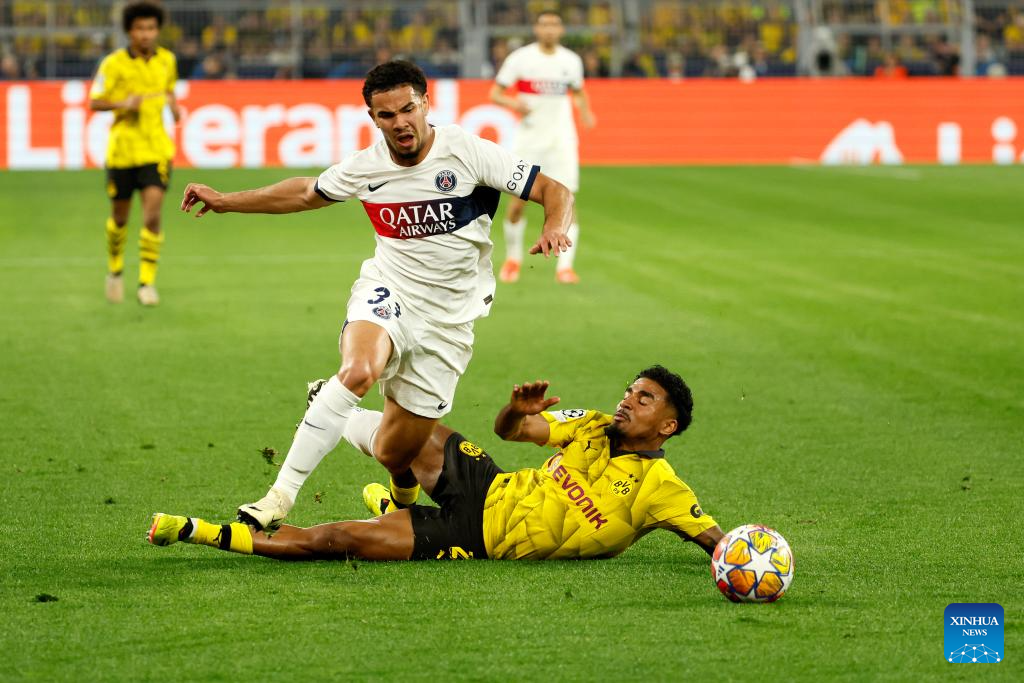 Ian Maatsen (R) of Borussia Dortmund vies with Warren Zaire-Emery of Paris Saint-Germain during the UEFA Champions League semi-final first leg football match between Borussia Dortmund and Paris Saint-Germain in Dortmund, Germany, May 1, 2024. (Photo by Joachim Bywaletz/Xinhua)