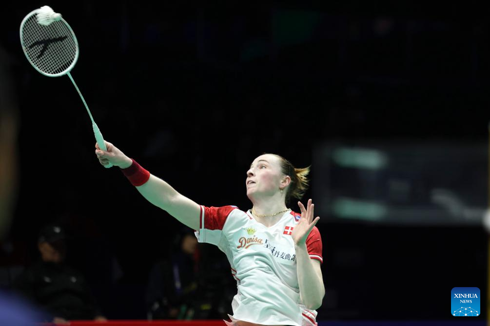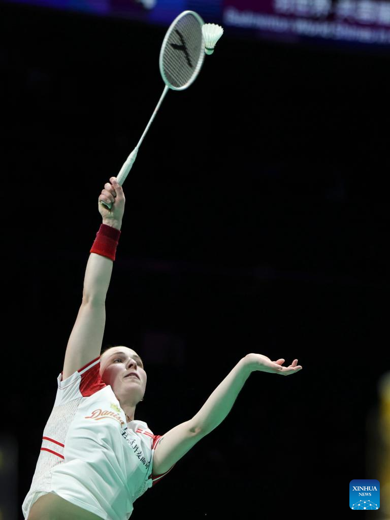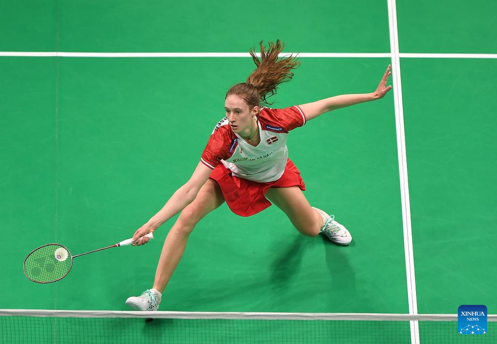 Line Hojmark Kjaersfeldt of Denmark competes with Chen Yufei of China in the singles match of the quarterfinal between China and Denmark at BWF Uber Cup Finals in Chengdu, southwest China's Sichuan Province, May 2, 2024. (Xinhua/Chen Bin)