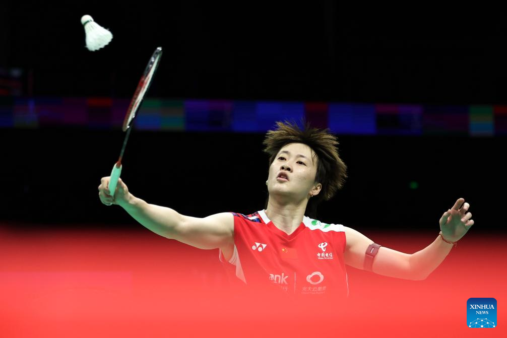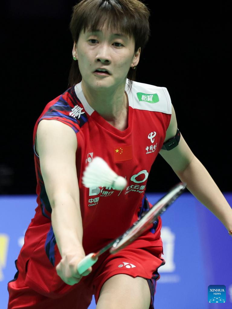Chen Yufei of China competes with Line Hojmark Kjaersfeldt of Denmark in the singles match of the quarterfinal between China and Denmark at BWF Uber Cup Finals in Chengdu, southwest China's Sichuan Province, May 2, 2024. (Xinhua/Chen Bin)