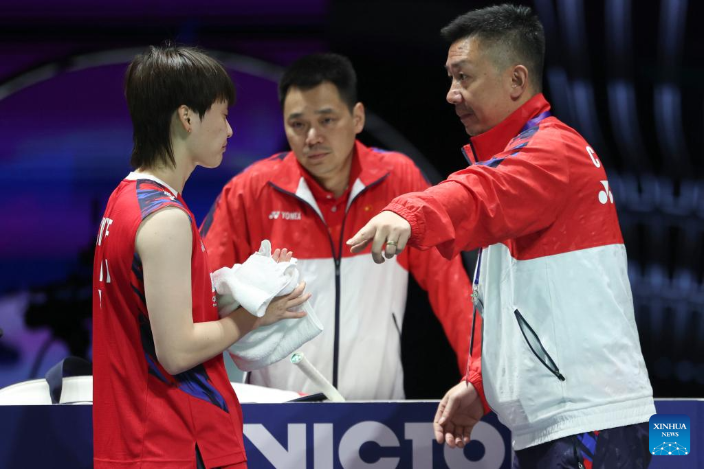 Chen Yufei (L) of China talks with coach Luo Yigang (R) while competing with Line Hojmark Kjaersfeldt of Denmark in the singles match of the quarterfinal between China and Denmark at BWF Uber Cup Finals in Chengdu, southwest China's Sichuan Province, May 2, 2024. (Xinhua/Chen Bin)