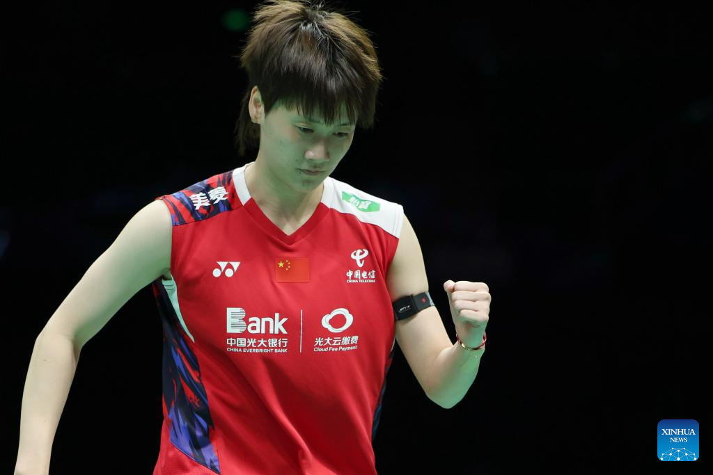 Chen Yufei of China reacts while competing with Line Hojmark Kjaersfeldt of Denmark in the singles match of the quarterfinal between China and Denmark at BWF Uber Cup Finals in Chengdu, southwest China's Sichuan Province, May 2, 2024. (Xinhua/Chen Bin)
