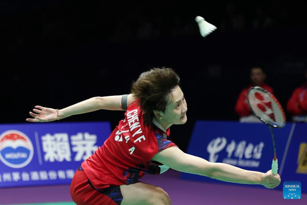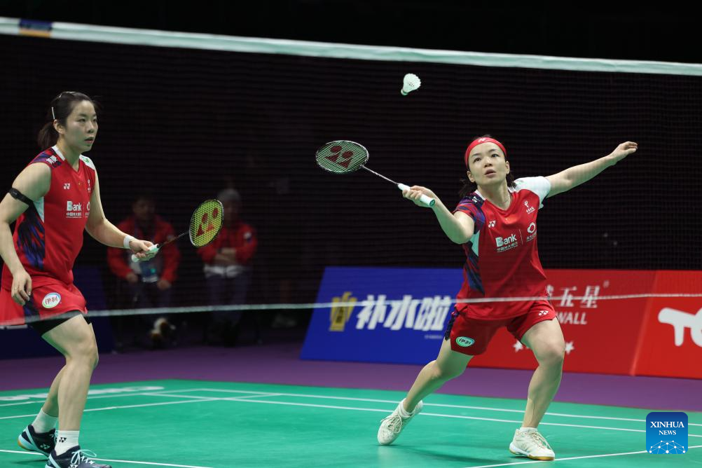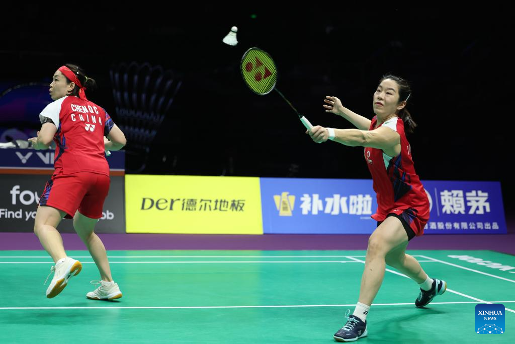 Chen Qingchen (R)/Jia Yifan of China compete with Alexandra Boje/Maiken Fruergaard of Denmark during the doubles match of the quarterfinal between China and Denmark at BWF Uber Cup Finals in Chengdu, southwest China's Sichuan Province, May 2, 2024. (Xinhua/Chen Bin)