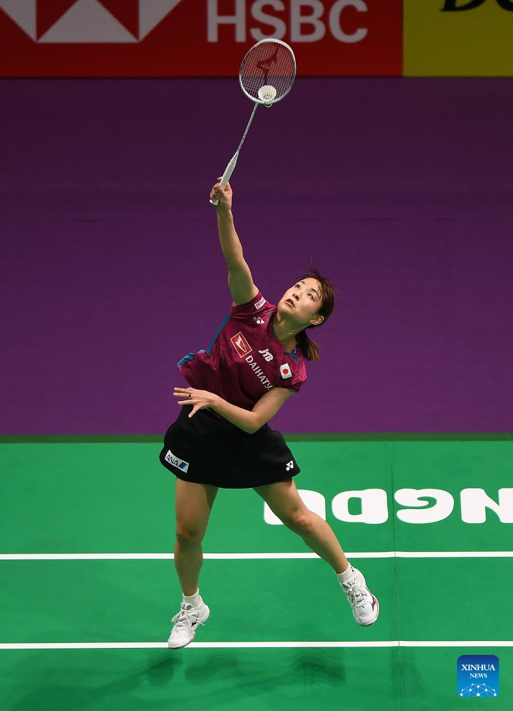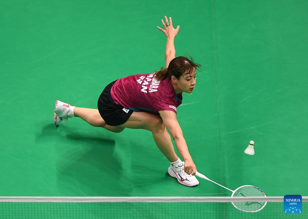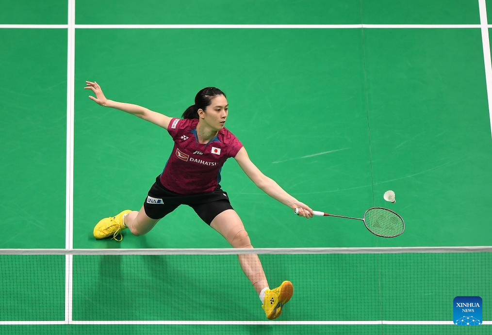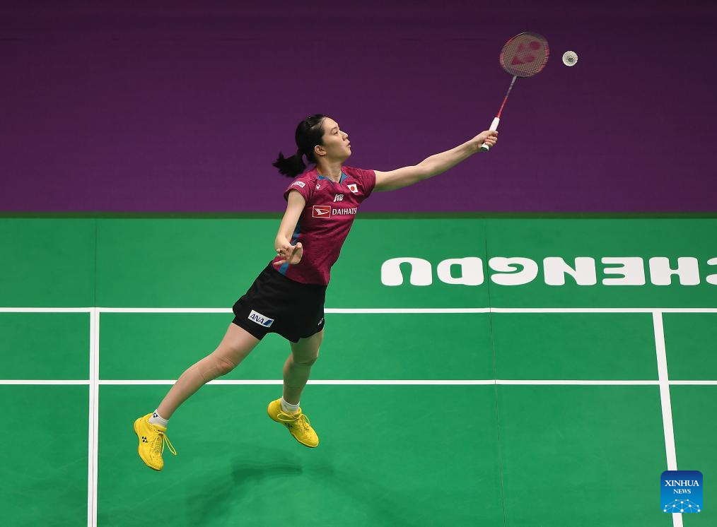 Okuhara Nozomi of Japan competes with Isharani Baruah of India in the singles match of the quarterfinal between Japan and India at BWF Uber Cup Finals in Chengdu, southwest China's Sichuan Province, May 2, 2024. (Xinhua/Hou Zhaokang)