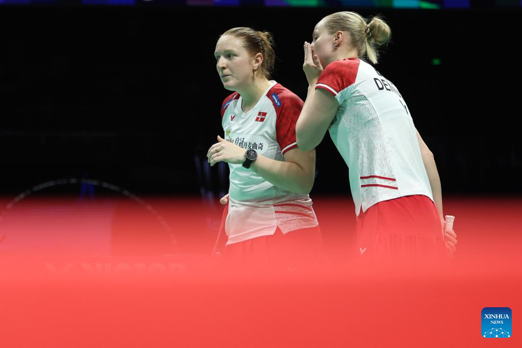 Alexandra Boje (R)/Maiken Fruergaard of Denmark react while competing with Chen Qingchen/Jia Yifan of China during the doubles match of the quarterfinal between China and Denmark at BWF Uber Cup Finals in Chengdu, southwest China's Sichuan Province, May 2, 2024. (Xinhua/Chen Bin)
