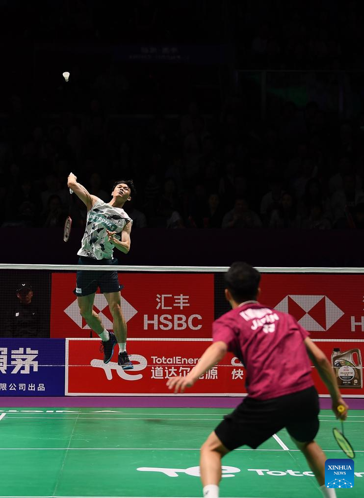 Lee Zii Jia (L) of Malaysia competes against Nishimoto Kenta of Japan in the singles match of the quarterfinal between Japan and Malaysia at BWF Thomas Cup Finals in Chengdu, southwest China's Sichuan Province, May 2, 2024. (Xinhua/Hou Zhaokang)