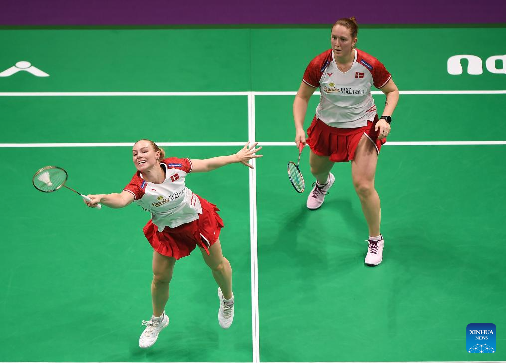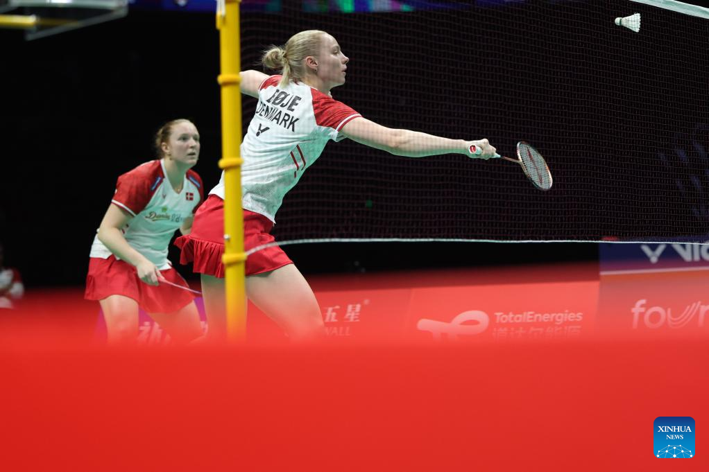 Alexandra Boje (R)/Maiken Fruergaard of Denmark compete with Chen Qingchen/Jia Yifan of China during the doubles match of the quarterfinal between China and Denmark at BWF Uber Cup Finals in Chengdu, southwest China's Sichuan Province, May 2, 2024. (Xinhua/Chen Bin)