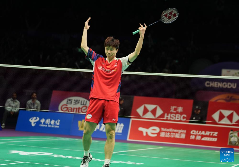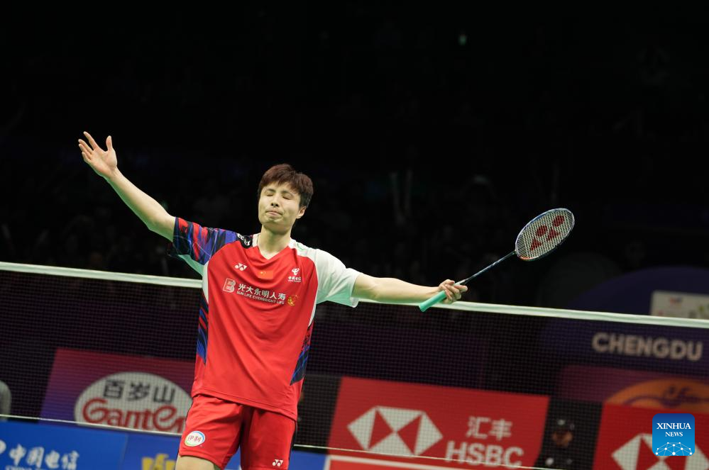 Shi Yuqi of China celebrates after winning the singles match against Prannoy H.S. of India during the quarterfinal between China and India at BWF Thomas Cup Finals in Chengdu, southwest China's Sichuan Province, May 2, 2024. (Xinhua/Jiang Hongjing)