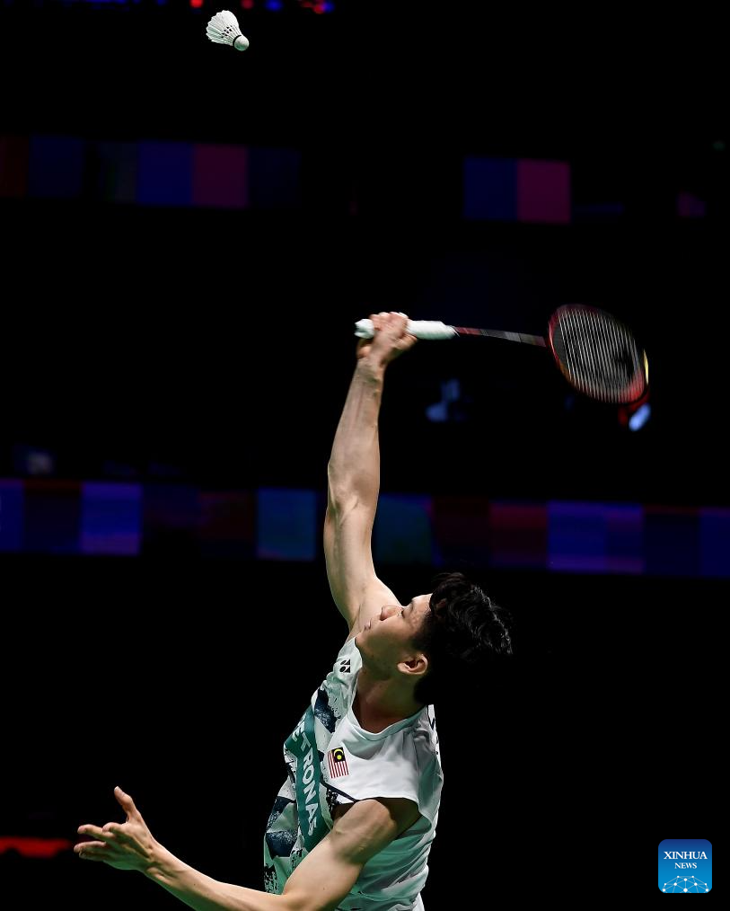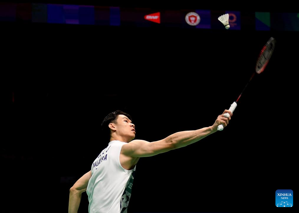 Lee Zii Jia of Malaysia competes against Nishimoto Kenta of Japan in the singles match of the quarterfinal between Japan and Malaysia at BWF Thomas Cup Finals in Chengdu, southwest China's Sichuan Province, May 2, 2024. (Xinhua/Hou Zhaokang)