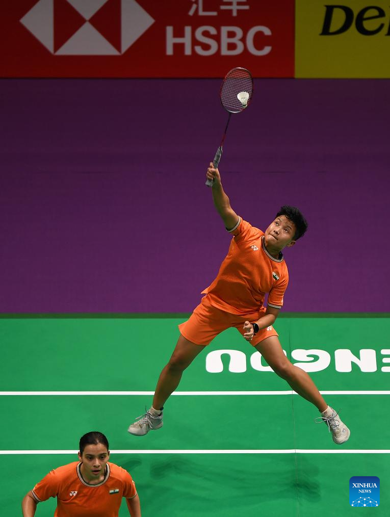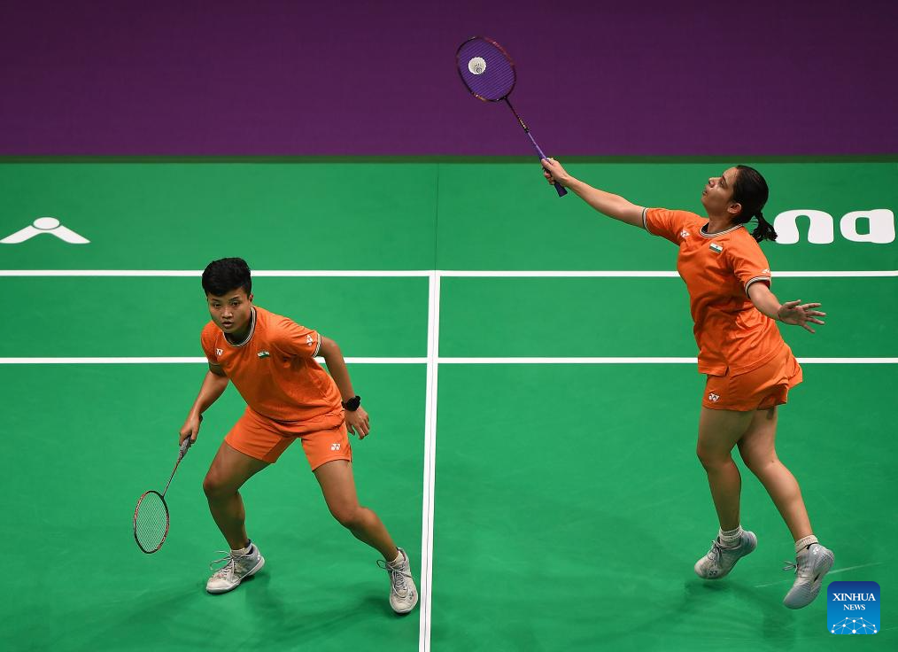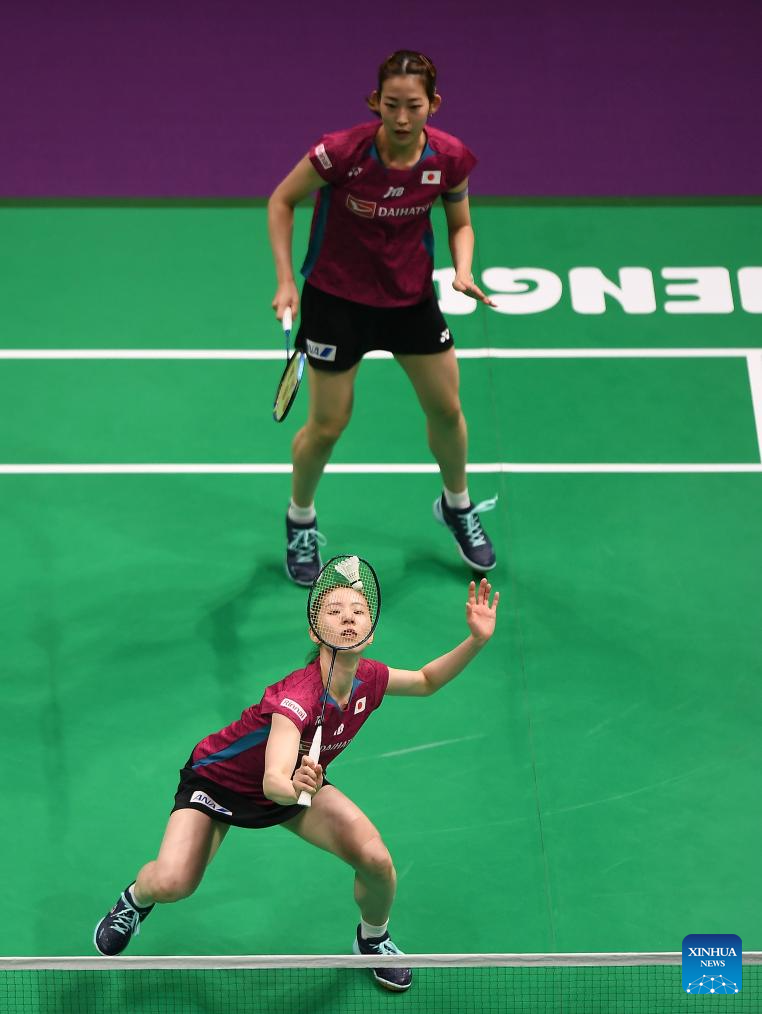 Priya Konjengbam/Shruti Mishra (R) of India compete with Matsuyama Nami/Shida Chiharu of Japan in the doubles match of the quarterfinal between Japan and India at BWF Uber Cup Finals in Chengdu, southwest China's Sichuan Province, May 2, 2024. (Xinhua/Hou Zhaokang)