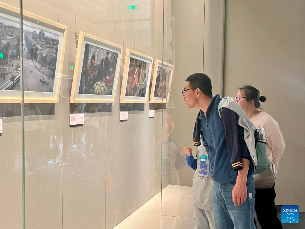 Visitors view photos exhibited at a photography exhibition named "Encounters·Silk Road--Xi'an in the Eyes of an Italian Journalist" at Xi'an Museum in Xi'an, northwest China's Shaanxi Province, May 1, 2024. This exhibition is a selection of 87 old photos of Xi'an taken by Italian sinologist, journalist, and photographer Adriano Madaro between 1979 and 1983. Through the photos taken by Madaro, the viewer can see a city street view, Shaanxi specialties, an agricultural market, the Bell Tower, the Terra Cotta Warriors, and other cultural attractions.(Xinhua/Cai Xinyi)