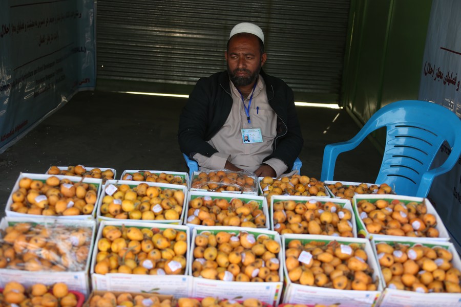 Photo taken on May 1, 2024 shows a booth at an exhibition of agricultural products in Kabul, capital of Afghanistan. (Photo by Saifurahman Safi/Xinhua)
