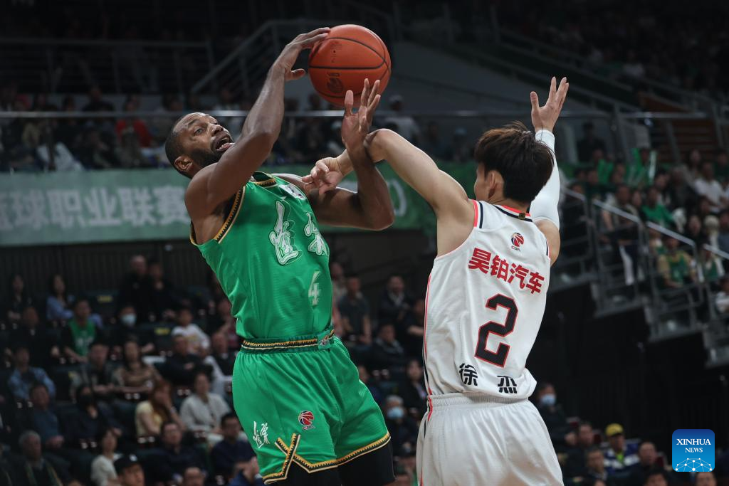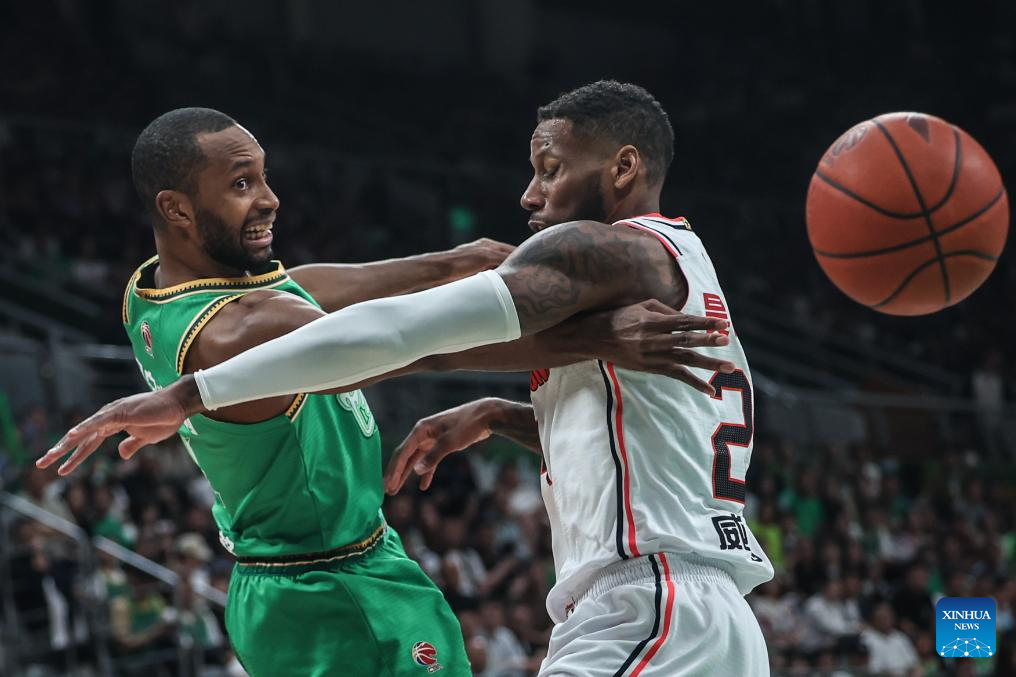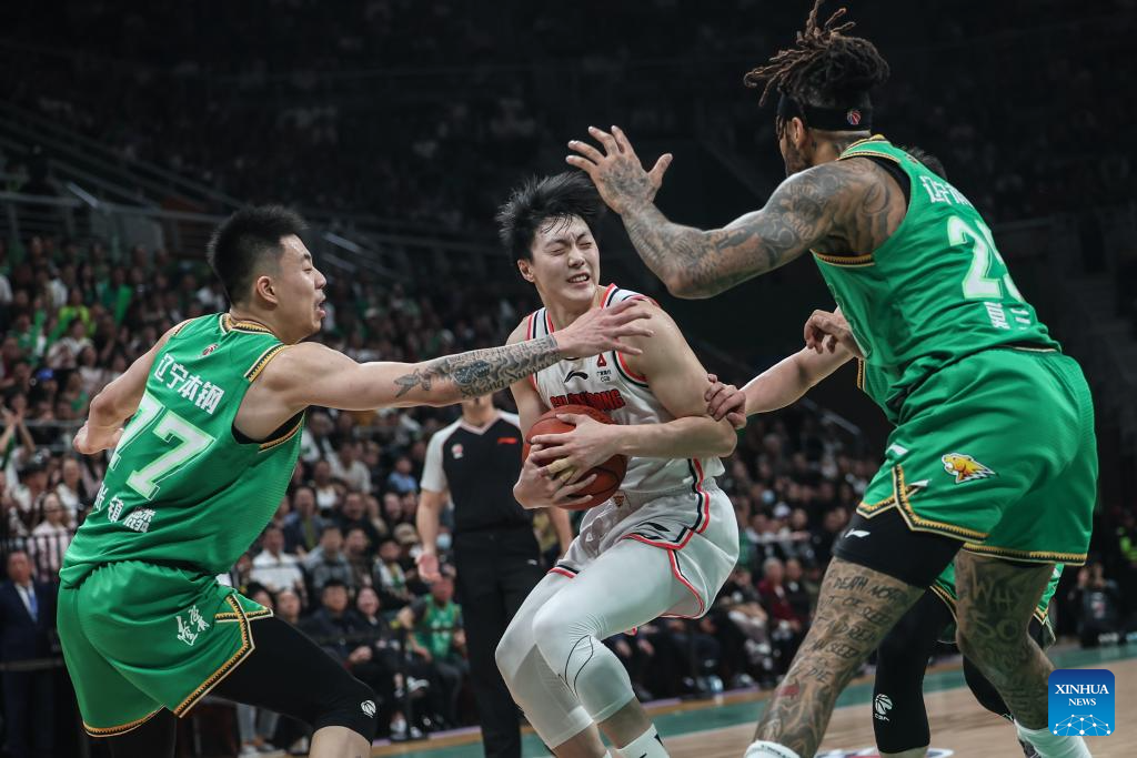 Xu Jie (1st L) of Guangdong Southern Tigers passes the ball during the play-off semifinal first leg match between Liaoning Flying Leopards and Guangdong Southern Tigers at the 2023-2024 season of the Chinese Basketball Association (CBA) league in Shenyang, northeast China's Liaoning Province, May 1, 2024. (Xinhua/Pan Yulong)